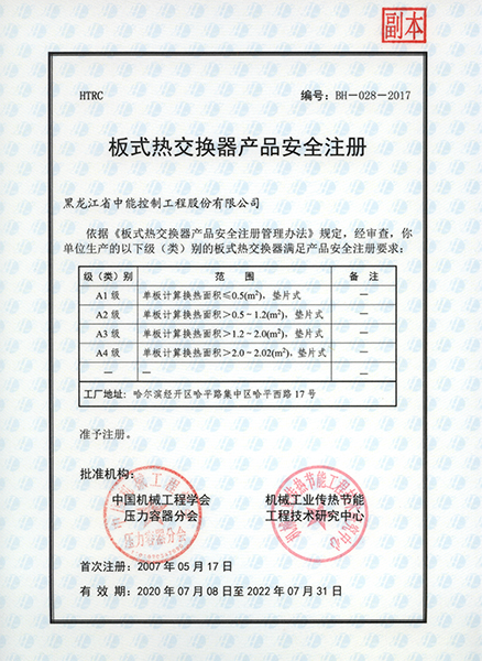 • 2007年獲得國(guó)家板式換熱器產(chǎn)品安全注冊(cè)證書(shū),并被批準(zhǔn)為國(guó)家級(jí)高新技術(shù)企業(yè)